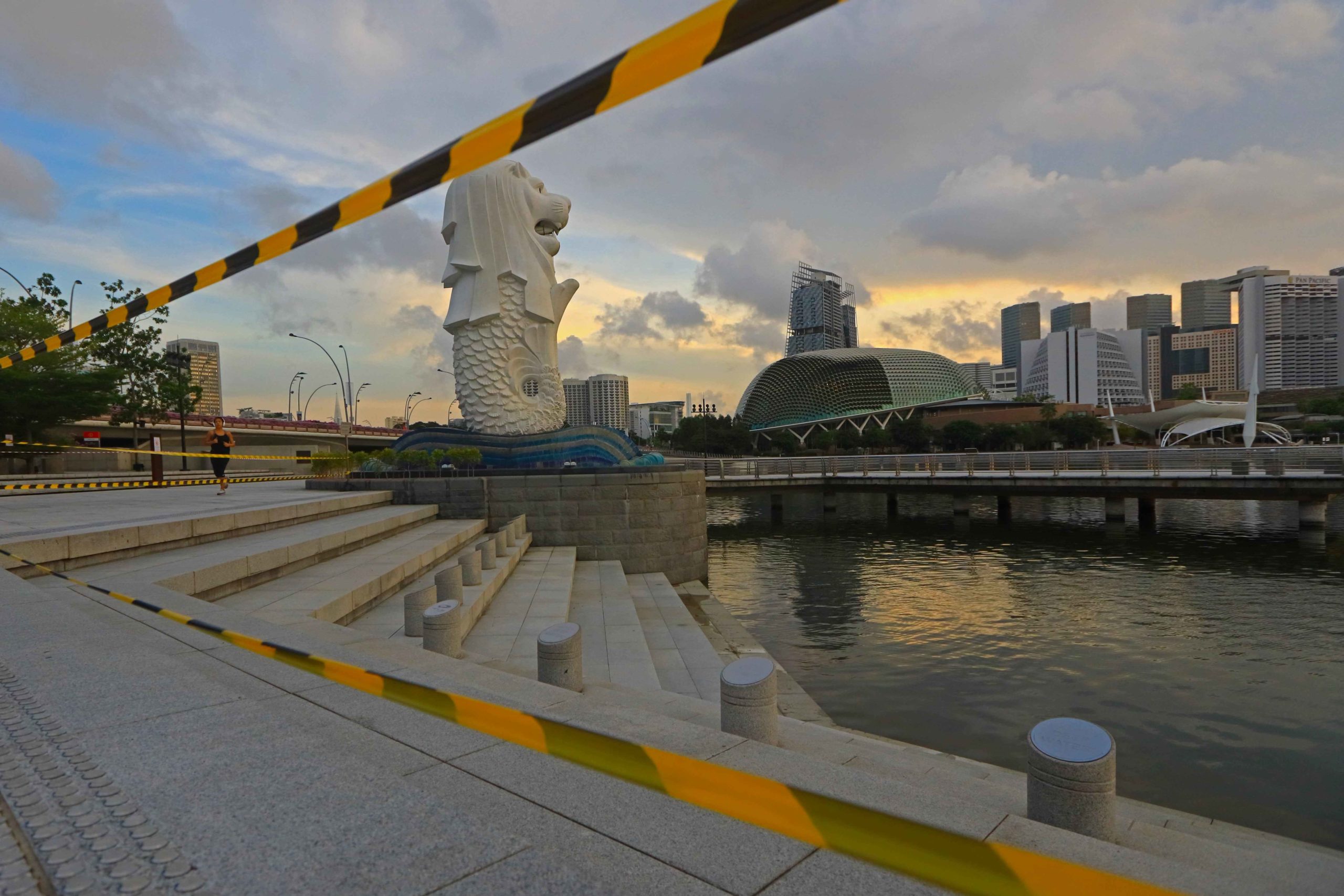 A woman jogs past a cordoned off Merlion Park on June 12, 2020 in Singapore.