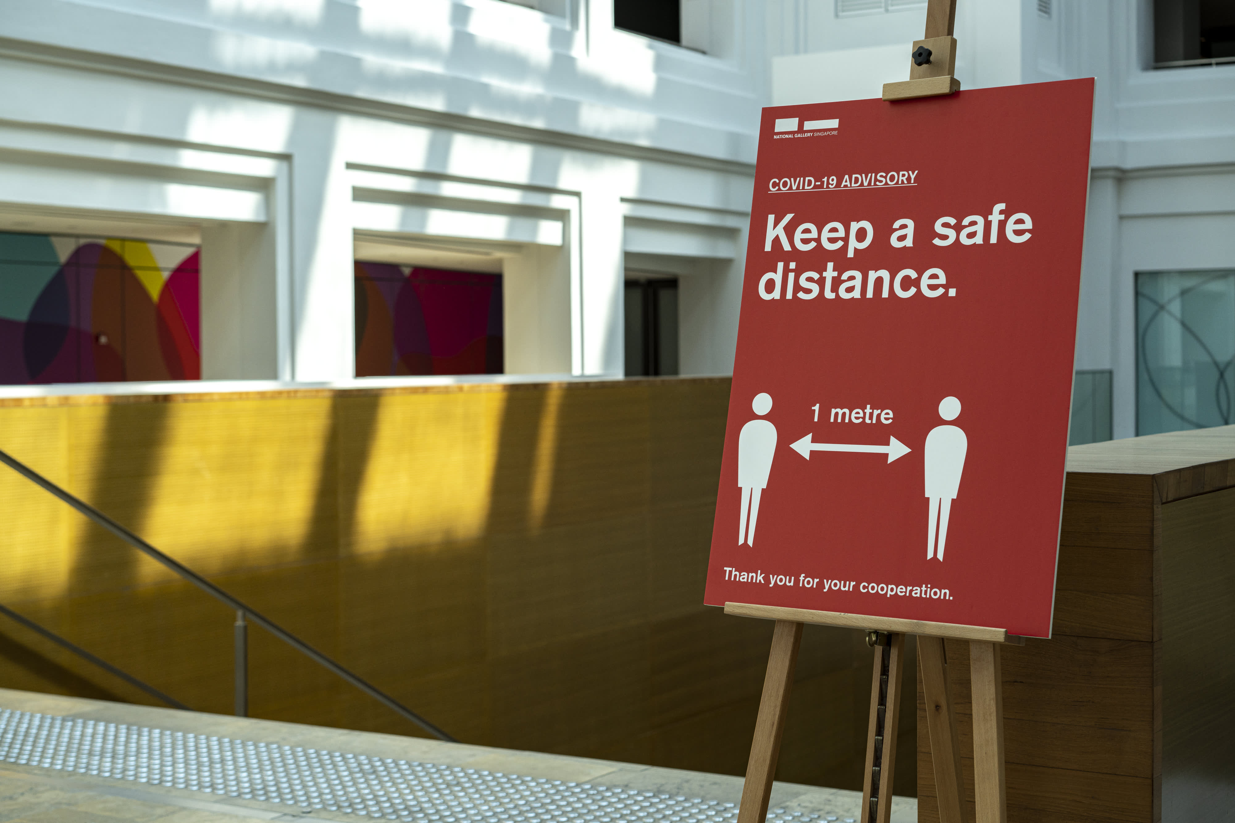 A poster reminding people to keep a safe distance from each other can be seen at the National Gallery of Singapore on March 30, 2020.