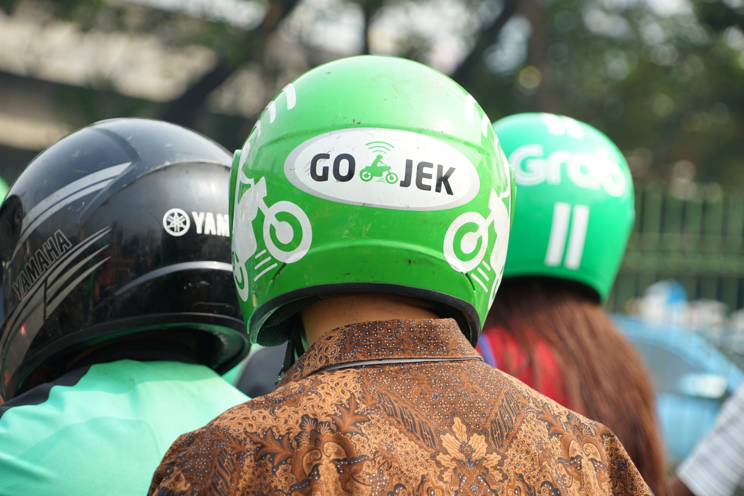Bike passengers wearing Helmet with Gojek logo.