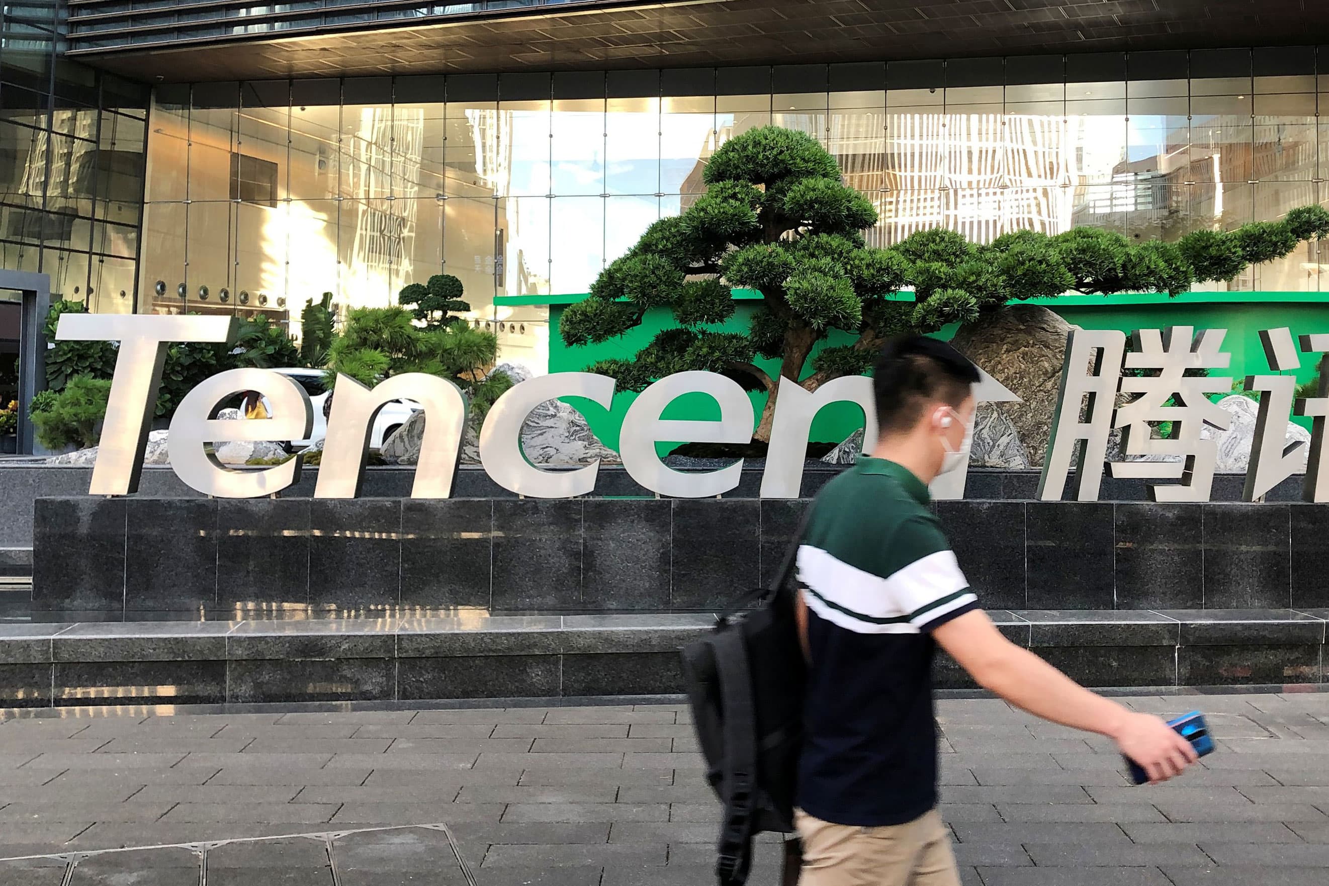 People walk past a Tencent sign at the company headquarters in Shenzhen, Guangdong province, China August 7, 2020.