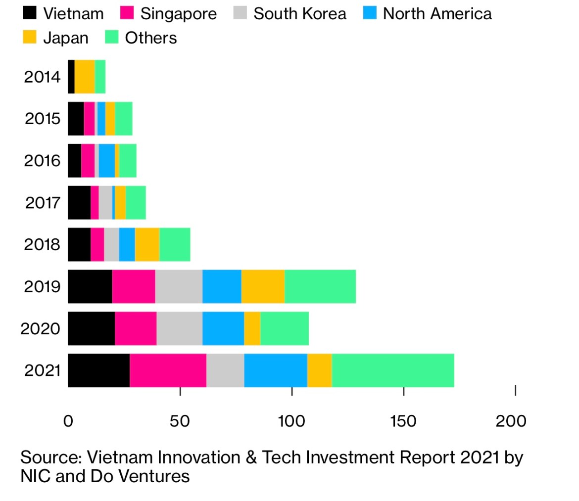 In 2021, Vietnam drew a record $2.6 billion through 233 private deals, up from the $700 million via 140 deals a year prior, according to a Google, Temasek Holdings Pte. and Bain & Co. report. Local firms are also competing with its Southeast Asian peers, accounting for 13% of the total venture funding flows into the region after Indonesia and Singapore in 2021, according to Do Ventures.