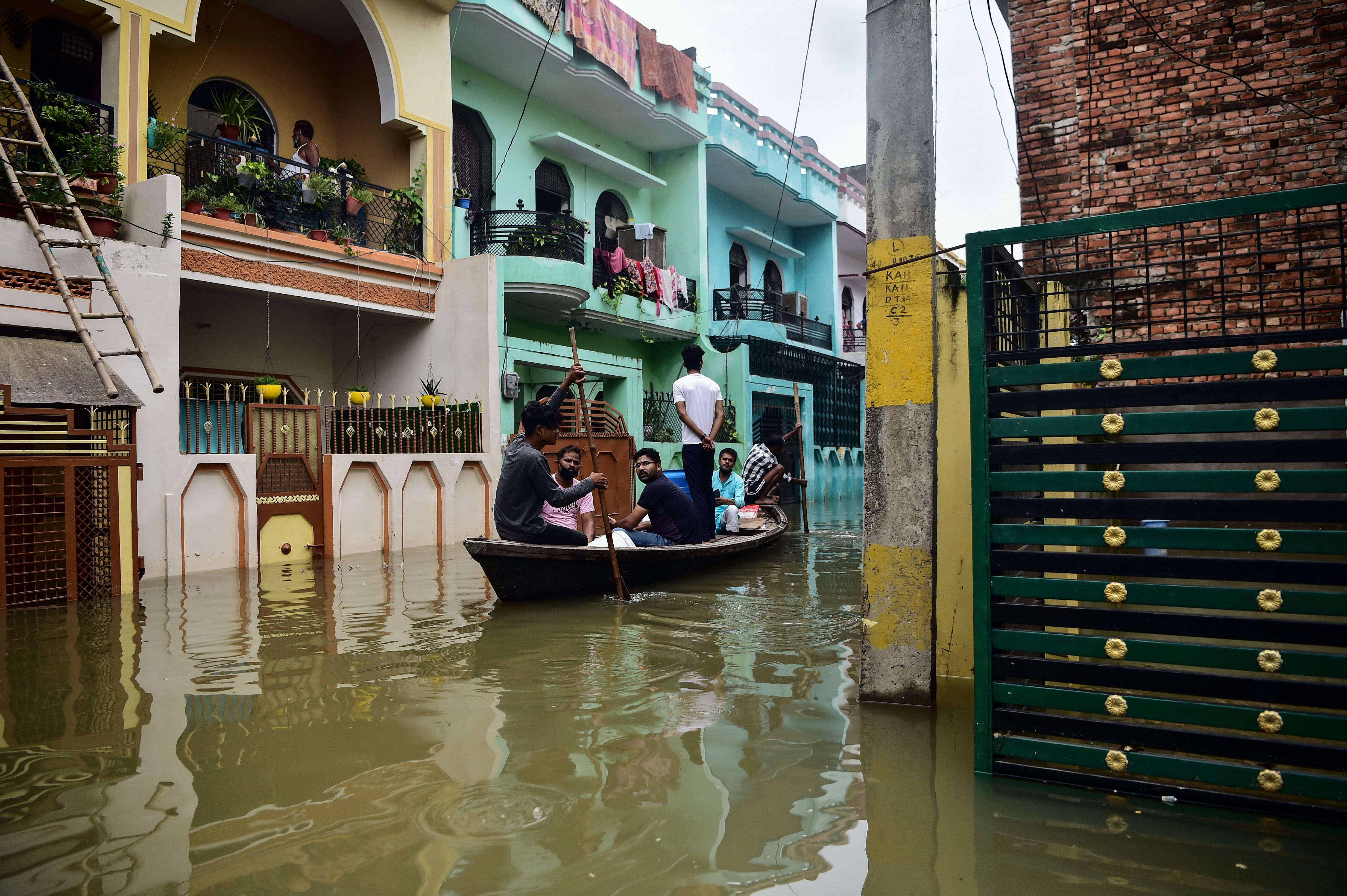Residents use a boat to move in a flooded neighbourhood in Kareli Gaus Nagar area of Allahabad on August 12, 2021 following heavy monsoon rainfalls that caused the overflowing of the Ganges and Yamuna Rivers.