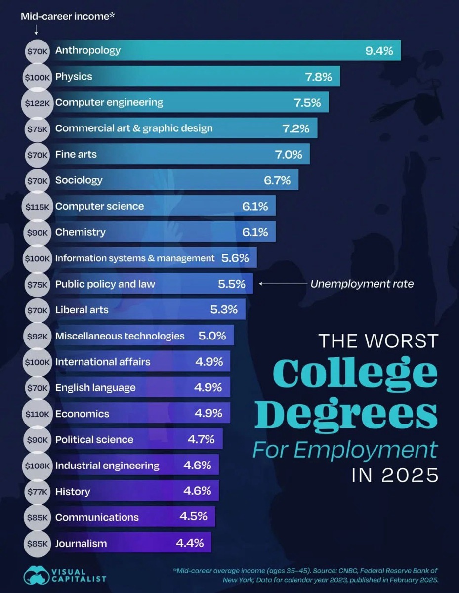 According to a new study published by Visual Capitalist using data from the Federal Reserve Bank of New York, some college degrees in 2025 carry significantly higher risks of unemployment—regardless of mid-career salary.