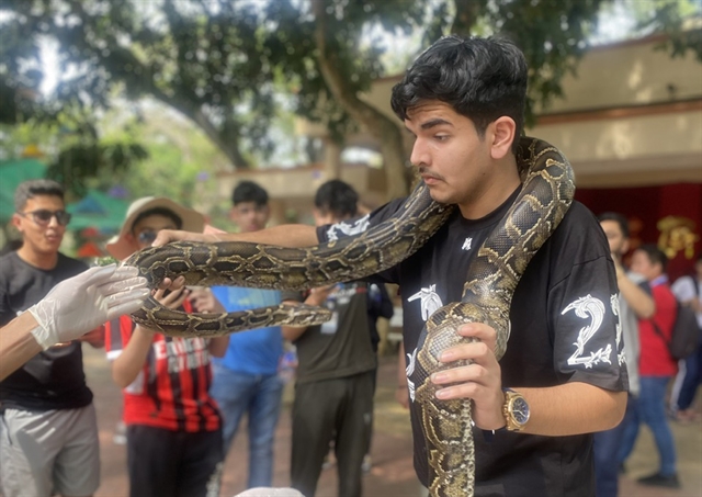 | A foreign tourist at the Đồng Tâm Snake Farm in Châu Thành District. – VNA/VNS Photo |