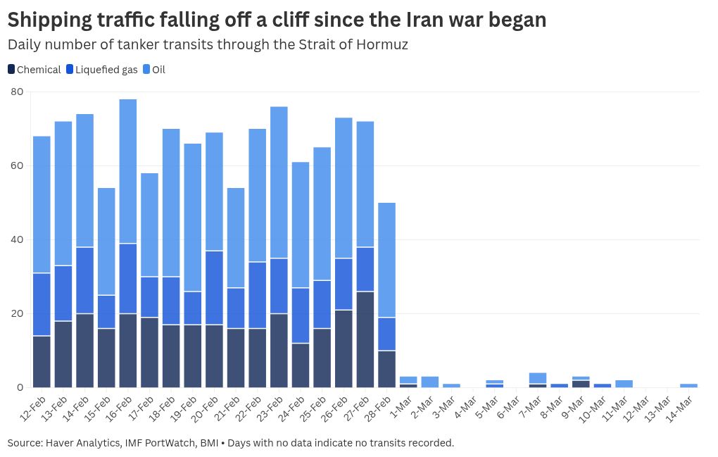 Oil tanker traffic through the Strait of Hormuz — a vital choke point for one-fifth of global oil supply and a significant share of LNG exports — has plunged since the war began, with the waterway effectively closed to most commercial shipping.