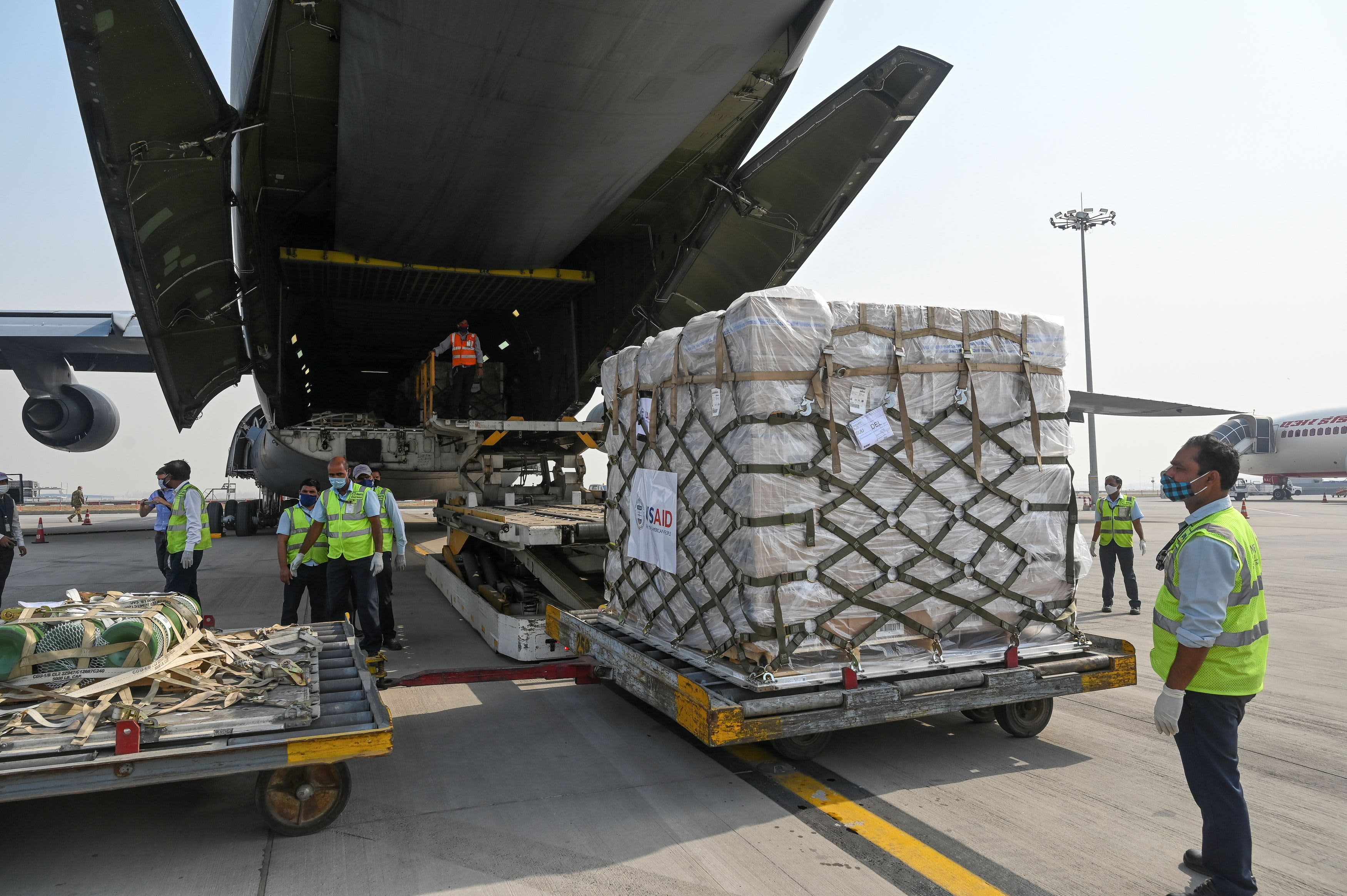 Ground staff unload coronavirus disease (COVID-19) relief supplies from the United States at the Indira Gandhi International Airport cargo terminal in New Delhi, India April 30, 2021.