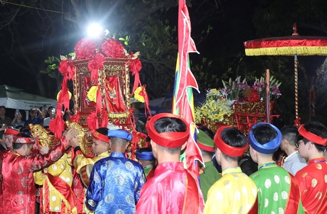 | Young men selected from the village carry the sacred seal palanquin in a traditional midnight procession. — VNS Photo Trần Huấn |