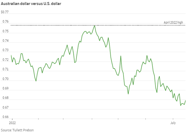 The effects of the dollar’s appreciation are spreading outside of Europe and Japan. Currencies that are used by traders to track sentiment towards growth prospects and equity markets, such as the AUD, have also fallen in recent days. The AUD has fallen more than 10% from its April high.