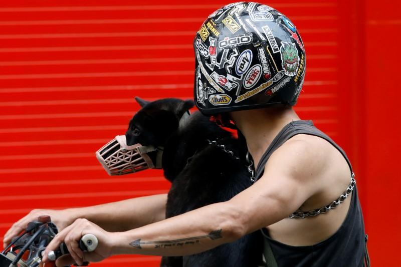 A man transports his dog on a motorcycle past a closed cafe during the coronavirus disease (COVID-19) outbreak in Hanoi, Vietnam March 27, 2020. REUTERS/Kham