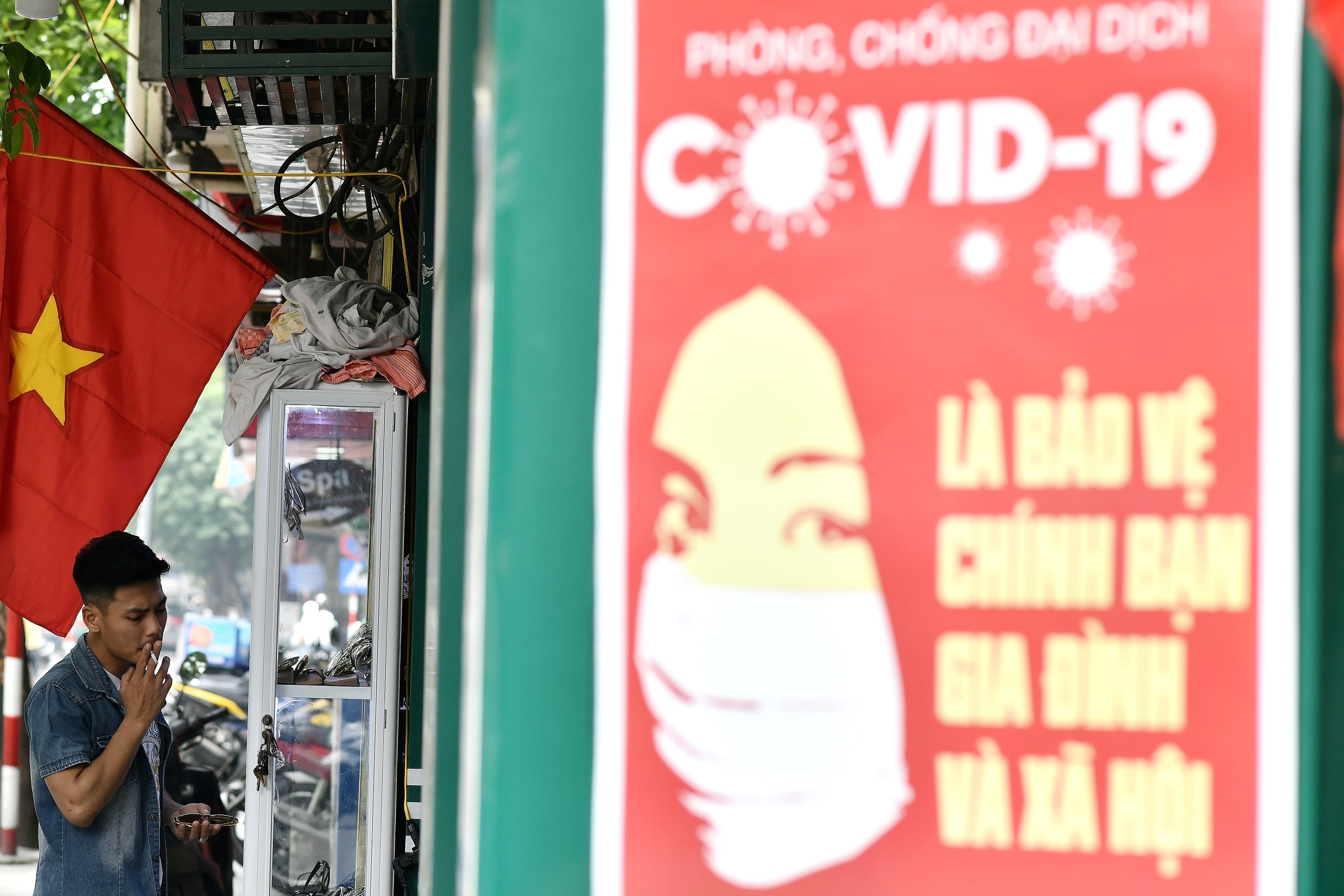A propaganda poster on preventing the spread of Covid-19 is seen on a wall as a man smokes a cigarette along a street in Hanoi on April 29, 2020.
