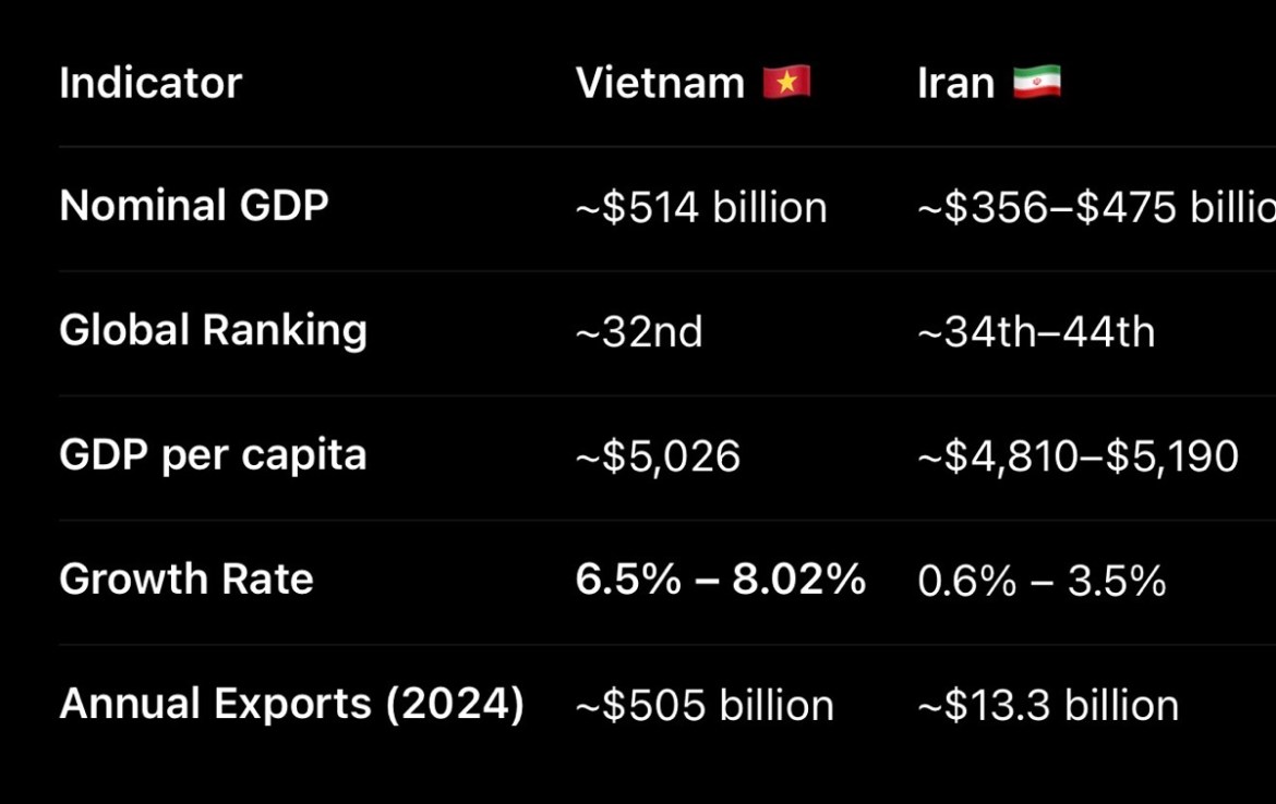 Vietnam’s export value alone is now larger than the entire GDP of several mid-sized economies and vastly exceeds Iran’s export base, which remains concentrated in energy products.