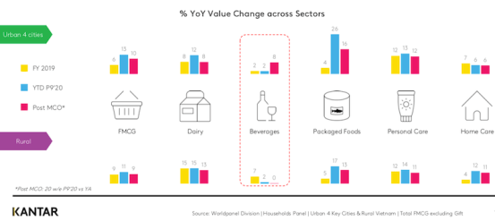 Among hot categories, personal care recorded 13% growth in the period. Beverage market has recovered with 8% growth in post-Covid-19 in four cities (including Hanoi, Danang, Can Tho and Ho Chi Minh City), while still struggled to bounce back in rural areas in post lockdown periods.