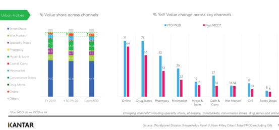 Notably, Kantar showed retail growth is cooling across all channels. With its value growth of 65%, online channel continues to gain share and is the fastest growing format post the social-distancing period. Following are drug stores (53%), pharmacy (33%), minimarket (22%), hyper & super (15%), cash & carry (14%) and wet market (14%).