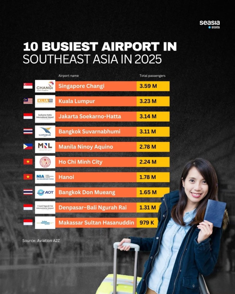 Southeast Asia’s Busiest Airports in 2025Kuala Lumpur International Airport (KLIA) followed with 3.23 million travelers, just ahead of Jakarta’s Soekarno-Hatta International Airport, which saw 3.14 million passengers. Thailand’s Suvarnabhumi Airport ranked fourth with 3.11 million, continuing to serve as a vital node in Bangkok’s dual-airport system alongside Don Mueang Airport, which ranked ninth with 1.65 million.