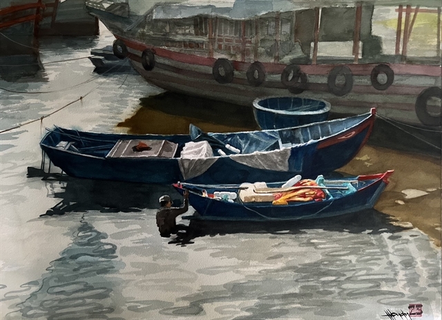Meanwhile, Quân introduces two watercolours depicting life on the river in the Cửu Long (Mekong) Delta. They are titled Câu Chuyện Bên Sông (A Story Beside River) and Chợ Nổi Phụng Hiệp (Phụng Hiệp Floating Market).