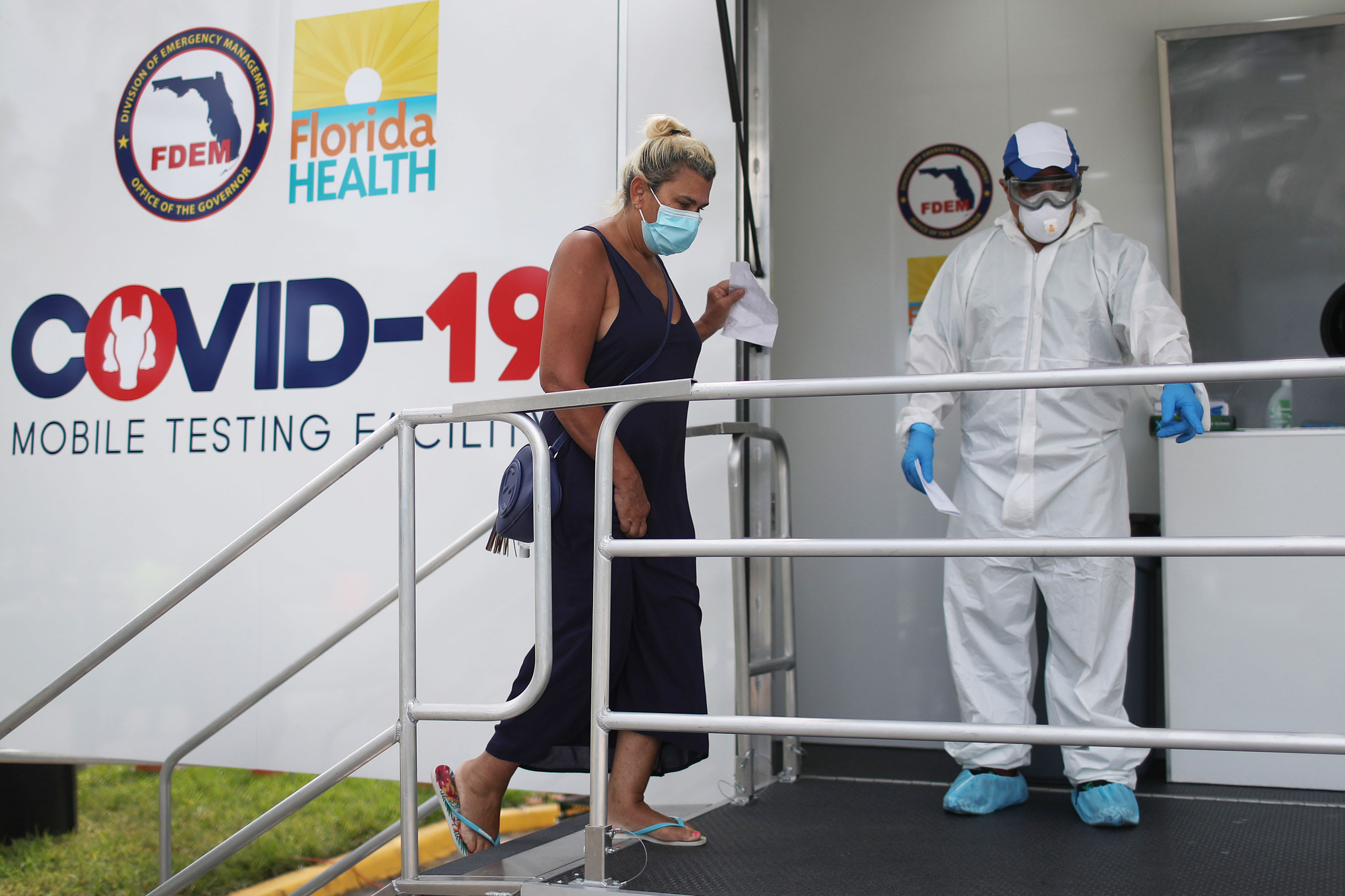 Carmen Garcia prepares to have her nose swabbed by a nurse through a glass pane in the Aardvark Mobile Health’s Mobile Covid-19 Testing Truck on July 17, 2020 in Miami Beach, Florida.